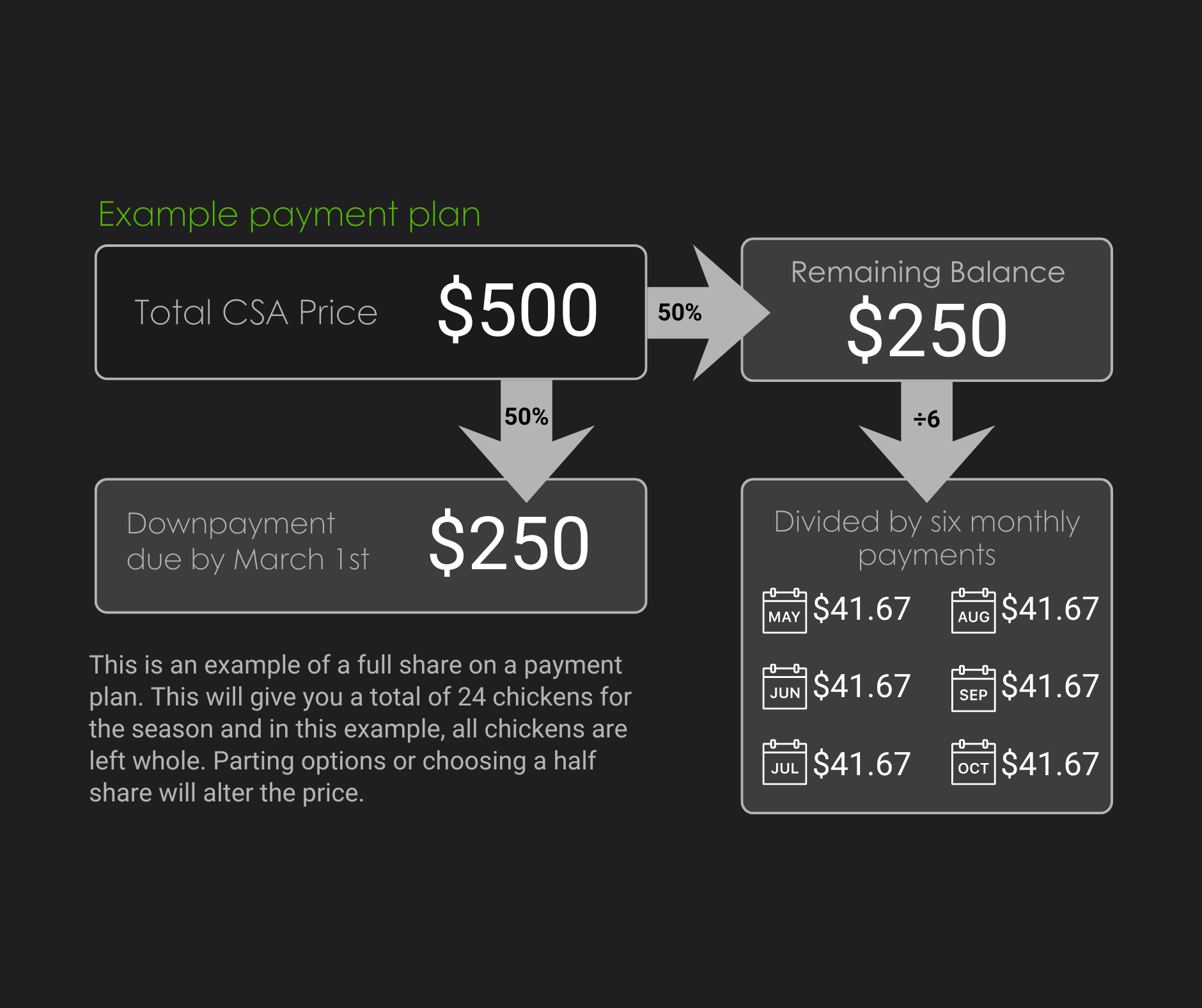 If you want to buy more chicken in addition to what is already included in your CSA, you will receive discounts of $1 off per item.