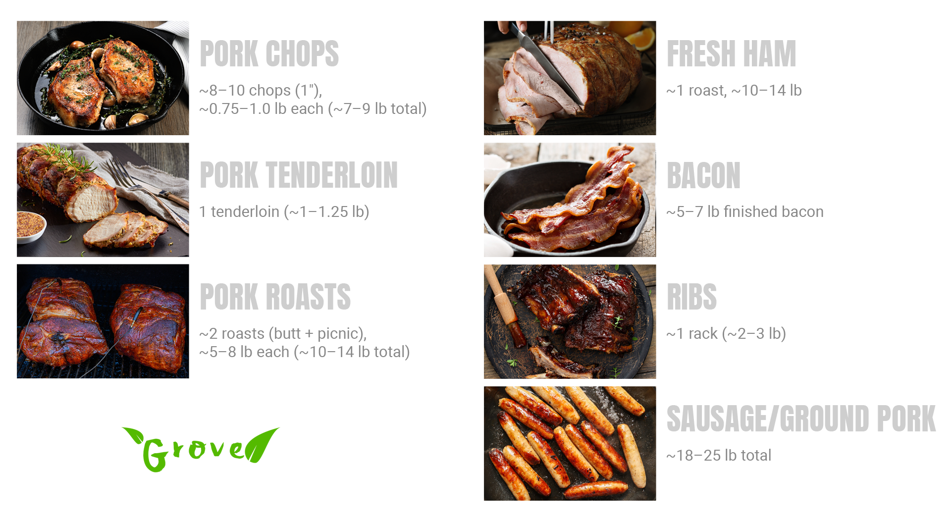 Below is an example of what you can expect to take home from half of a pig. The cuts listed are a representative sample, exact quantities and options can vary based on how you choose to have your pig processed, but this gives a solid picture of the volume and variety involved.